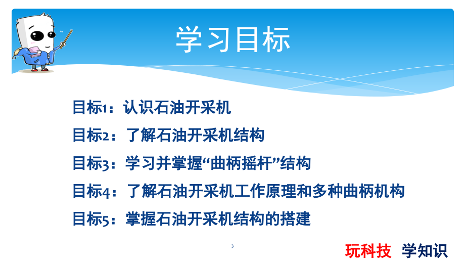 ,单击此处编辑母版标题样式,*,*,单击此处编辑母版文本样式,第二级,第三级,第四级,第五级,1,机器人等级考试二级,-,石油开采机,-,玩科技,学知识,2,学习目标,目标,1,:认识石油开采机,目标,2,:了解石油开采机结构,目标,3,:学习并掌握“曲柄摇杆”结构,目标,4,:了解石油开采机工作原理和多种曲柄机构,目标,5,:掌握石油开采机结构的搭建,玩科技,学知识,3,认识石油开采机,石油开采机是开采石油的一种机器,俗称“磕头机”,也称抽油机。常见的抽油机机分为,游梁式抽油机,和,无游梁式抽油机,。,石油:可以用来提炼汽油、煤油、柴油、重油、沥清等,玩科技,学知识,4,两种石油开采机区别,游梁式抽油机:有游梁,结构简单,占地面积大。,无游梁式抽油机:无游梁,先进,占地面积小。,玩科技,学知识,5,石油开采机结构特点?,观察结构联想工作过程?,玩科技,学知识,6,玩科技,学知识,石油开采机结构特点总结,组成:游梁部分、支架部分、减速器部分和配电部分。,游梁部分:驴头、游梁、横梁、尾梁、连杆、平衡杆;,支架部分:中央轴承座、工作梯、护圈、操作杆、支架,;,减速器部分:底船、减速器筒座、减速器、曲柄等;,配电部分:电机座、电机配电箱等。,7,石油开采机工作分析,为什么石油开采机可以抽石油?,连杆是干嘛的?,电动机是起什么作用的?,玩科技,学知识,8,认识曲柄机构,石油开采机,缝纫机脚踏板,玩科技,学知识,9,曲柄机构介绍,曲柄滑块机构:,指用,曲柄,和,滑块,来实现转动和移动相互转换的平面连杆机构,曲柄摇杆(连杆)机构:,具有,一个曲柄,和,一个摇杆,的铰链四杆机构,组成:机体组、活塞连杆组、曲柄连杆组。,玩科技,学知识,10,认识平面四杆机构,平面四杆机构,:指,各个运动构件均在,同一平面内运动,的机构,常见形式,:,曲柄连杆机构,、,双曲柄机构,、,平行双曲柄机构,、,反向双曲柄机构,和,双摇杆机构,玩科技,学知识,11,什么是曲柄连杆机构?,曲柄连杆机构:可以理解为曲柄摇杆机构。,特点:平面连接杆机构中,最短杆,与,最长杆,长度,之和,其余两杆长度,之和,玩科技,学知识,12,什么是双曲柄机构?,双曲柄机构:两个曲柄,都是在画圆。,特点:平面连接杆机构中,最短杆,与,最长杆,长度,之和,其余两杆长度,之和,玩科技,学知识,13,什么是平行双曲柄机构?,平行双曲柄机构:两个曲柄,对边相等,形成一个平行四边形。,特点:主动曲杆,AB,与从动曲杆,DC,以相同的速度沿,同一个方向,作圆周运动,连杆,BC,作平行移动。,玩科技,学知识,14,什么是反向双曲柄机构?,反向,双曲柄,机构:两个曲柄,连杆与机架的长度相等,两个曲柄转向相反。,特点:主动曲柄与从动曲柄均做圆周运动,但是,转向相反,。,玩科技,学知识,15,什么是双摇杆机构?,双摇杆机构,:,无曲柄,含有两个摇杆。,特点:当,一个,摇杆在,摆动,时,另一个,摇杆也,随着摆动,。,玩科技,学知识,16,曲柄机构总结,曲柄,连杆,滑块,曲柄连杆机构,含有,至少,一个曲柄,和,一个连杆,。,平行双曲柄机构、反向双曲柄机构、双曲柄机构,均含有,两个曲柄,玩科技,学知识,17,思考?,1,、生活中有哪些常见的曲柄机构?是什么类型的曲柄机构呢?,玩科技,学知识,18,推磨,玩科技,学知识,19,小练习,1,、曲柄连杆机构主要由哪些构建组成()?,A,、圆环组,B,、机体组,C,、活塞连杆组,D,、曲柄飞轮组,2,、下列哪些应用到曲柄机构()?,A,、缝纫机,B,、千斤顶,C,、自行车,D,、石油开采机,3,、常见的曲柄连杆机构至少需要一个()和()?,4,、,下列图片中使用了连杆机构的是,(),5,、,曲柄摇杆机构能使整周回转运动变为往复摆动,但不能把往复摆动变为整周回转运动。对还是错?,6,、自行车没有曲柄结构。,7,、,曲柄连杆机构主要由哪些组成()?,A.,圆环组。,B.,机体组。,C.,活塞连杆组,D.,曲轴飞轮组。,A,B,C,D,20,课程回顾,21,尺蠖模型搭建实操,基础薄板,1,个,孔砖,15,孔,2,个,孔砖,9,孔,2,个,孔砖,7,孔,4,个,孔板 双排,8,柱,4,个,弯角直连接件,2,个,黑色销子,4,个,十字销子,4,个,黑色长轴,2,个,红色轴,1,个,轴套黄色,4,个,轮与套,4,个,8,齿齿轮,1,个,冠形齿轮,1,个,22,实操模型准备,基础薄板,1,个,孔砖,15,孔,2,个,孔砖,9,孔,2,个,孔砖,7,孔,4,个,孔板 双排,8,柱,4,个,弯角直连接件,2,个,黑色销子,4,个,十字销子,4,个,黑色长轴,2,个,红色轴,1,个,轴套黄色,4,个,轮与套,4,个,8,齿齿轮,1,个,冠形齿轮,1,个,23,模型搭建,24,模型搭建,25,模型搭建,26,模型搭建,27,模型搭建,28,模型搭建,29,模型搭建,30,模型搭建,31,模型搭建,32,机架稳定性,以孔砖与板块搭建基础机身,可以尽量多使用些孔砖板块,使搭建越稳固,33,机构运动性,机构运动以轴为中心,配以齿轮与电机齿轮组成垂直传动结构,连接直孔臂,轴套限位,完成运动性,运动中心切记一定是轴,垂直传动 电机上齿轮与螺旋桨齿轮之间距离匹配把握好,34,外观相似性,后驱驱动车整体外观可以在搭建更像一些,外观相似性尽量要做到相似,有时间可以在装饰一下,35,课程回顾,36,