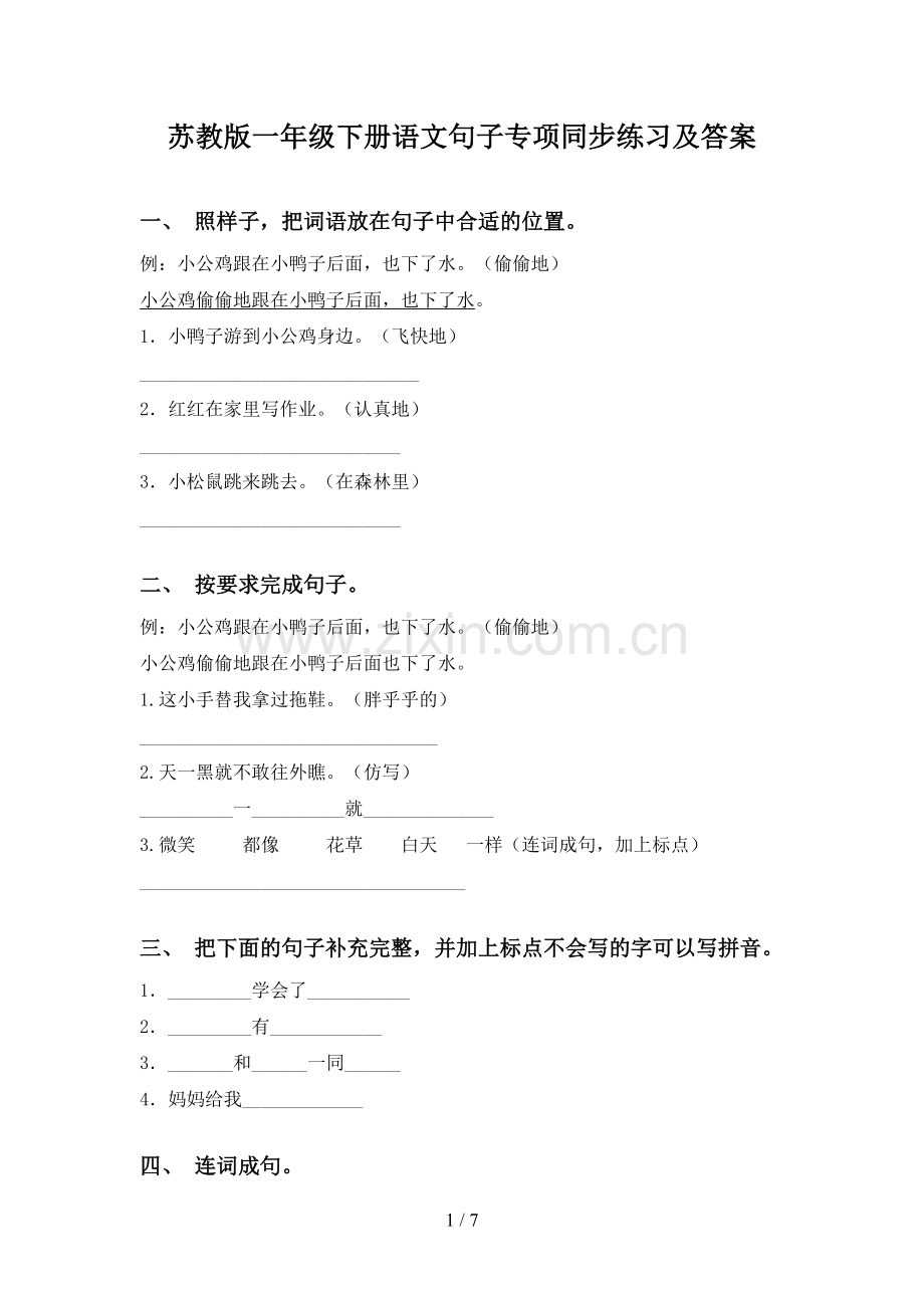 一、 小鸭子飞快地游到小公鸡身边。 红红在家里认真地写作业。 小松鼠在森林里跳来跳去。
