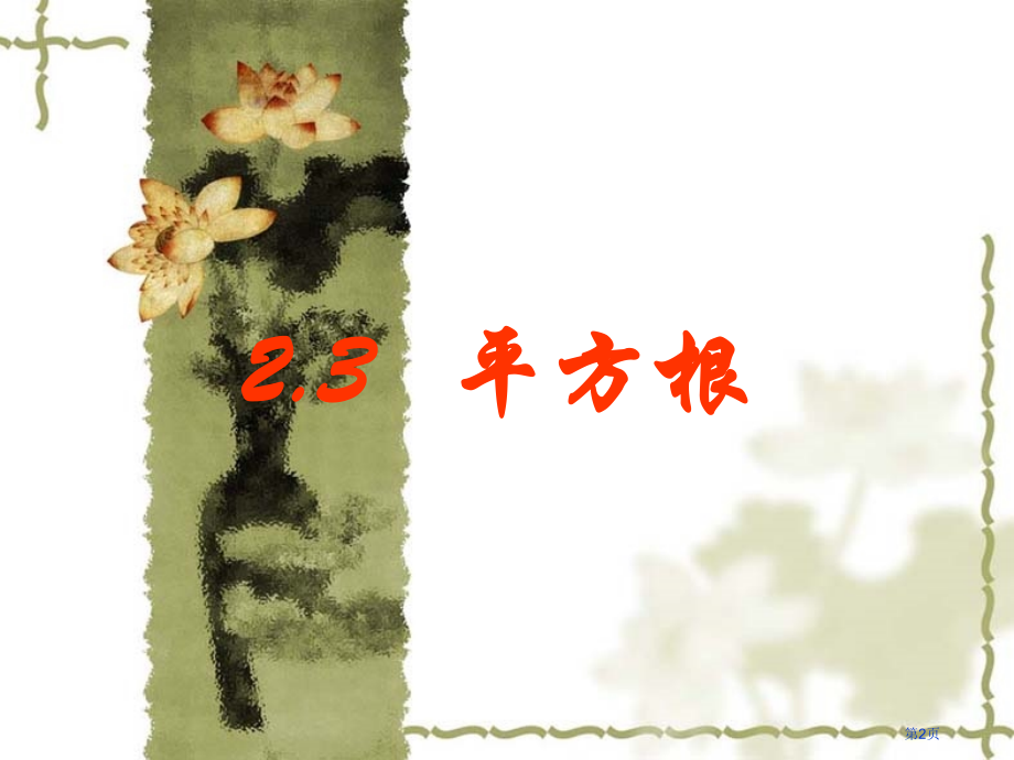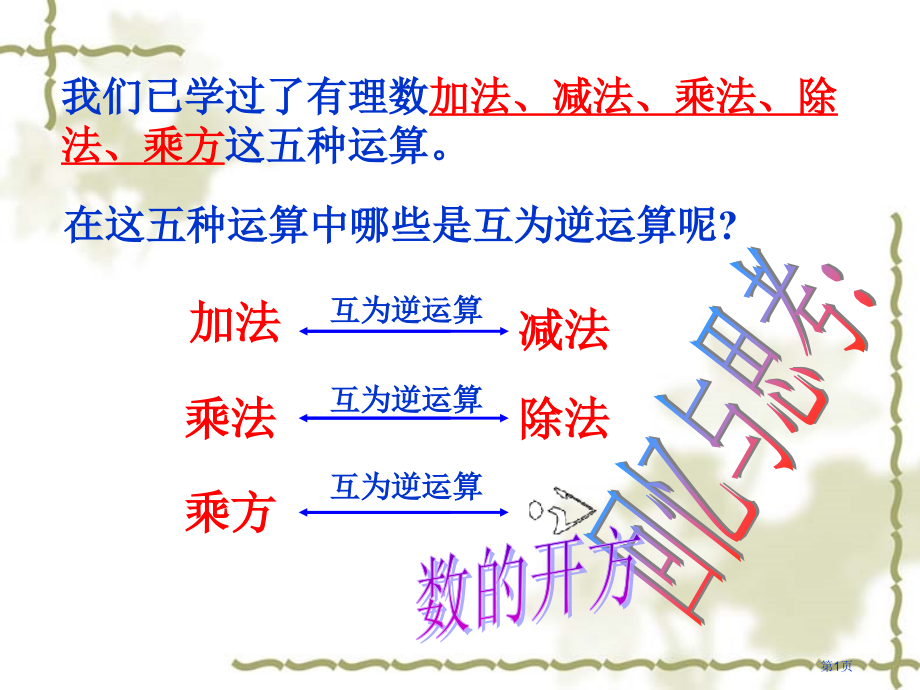 单击此处编辑母版标题样式,单击此处编辑母版文本样式,第二级,第三级,第四级,第五级,*,加法,减法,乘法,除法,乘方,互为逆运算,?,我们已学过了有理数,加法、减法、乘法、除法、乘方,这五种运算。,在这五种运算中哪些是互为逆运算呢?,回忆与思考:,互为逆运算,互为逆运算,数的开方,第1页,2.3 平方根,第2页,一个数平方等于9,这个数是几?,一个数平方等于2,这个数是几?,第3页,我们把括号里,5,叫做25,平方根(二次方根),。,就是说,假如 ,那么 叫,平方根,,叫,平方,。,5,普通地,,假如一个数平方等于,a,,这个数就叫做,a,平方根(,square root,或二次方根),.,第4页,5 和 5 都是25平方根。,和,都是 平方根。,36平方根是多少?,例:,第5页,一个正数有两个平方根,这两个平方根互为相反数。,0,2,=0,零平方根是零。,负数呢?,任何数平方都不可能是负数.,负数没有平方根.,你能编几个求平方根题目,考考你周围同学吗?,第6页,平方根性质:,一个正数有两个平方根,,它们互为相反数;,零平方根是零;,负数没有平方根。,非负数才有平方根,负数没有平方根。,第7页,假如把正方形面积25平方厘米改为2平方厘米,,它边长是多少厘米呢?,第8页,(a0),正平方根,表示为:,负平方根,表示为:,非负数,a平方根,表示为:,一个非负数平方根表示方法:,0平方根也叫做0算术平方根.,正数,a,正,平方根叫做a,算术,平方根.,非负数a算术平方根,表示为,:,第9页,被开方数,请熟悉:,a平方根,读作:,正负根号a,(a0),根号,普通地,假如一个数平方等于,a,,这个数就叫做,a,平方根,第10页,请熟悉:a算术平方根,a0,0,0平方根也叫做0算术平方根,。,正数,a,正,平方根,叫做a,算术平方根,读作:,根号a,求非负数平方根运算,叫做,开平方,。,双重非负性,平方与开平方,互为逆运算,.,第11页,学以致用,非负数,a平方根,非负数a算术平方根,例1、判断以下各数有没有平方根,假如有平方根,试求出它平方根;假如没有平方根,说明理由。,(1)81,(2)81,(3)0,(4),(5),第12页,例2、求以下各数平方根和算术平方根。,解,:(1),注意:不能写成,请你仿照上面例子完成其余7个小题,。,(1)100;(2)1.44;(3);(4),(5)0.0036 (6,),26,(7)(8)0,第13页,1、判断题:,(1)0.1是0.01平方根,.(),(2)(),练一练,非负数,a平方根,非负数a算术平方根,(3),算术平方根是它平方根,(),(4)-6是(-6),2,一个平方根.(),(5)假如两个数平方后相等,那么它们也相等.(),第14页,(6)(),(7)2是4平方根,4平方根是2(),非负数,a平方根,非负数a算术平方根,第15页,非负数,a平方根,非负数a算术平方根,2、各表示什么意义?,3、,填空,(1),(2),(3),(4),9,3,81,3,25,第16页,4、讨论:,第17页,例3 (1)若 有意义,则a取值范围 是,。,(2)若 ,则a=,,b=,。,(3)若 ,则,。,1,0,2,第18页,(4)、假如一个数平方根是a+3与2a-15,那么这个数是,_,.,(5)、若5x+4,平方根是1,则x=_.,(6)、假如b是a平方根,那么a、b满足关系为_,第19页,小结与收获:,今天你学习了?,第20页,