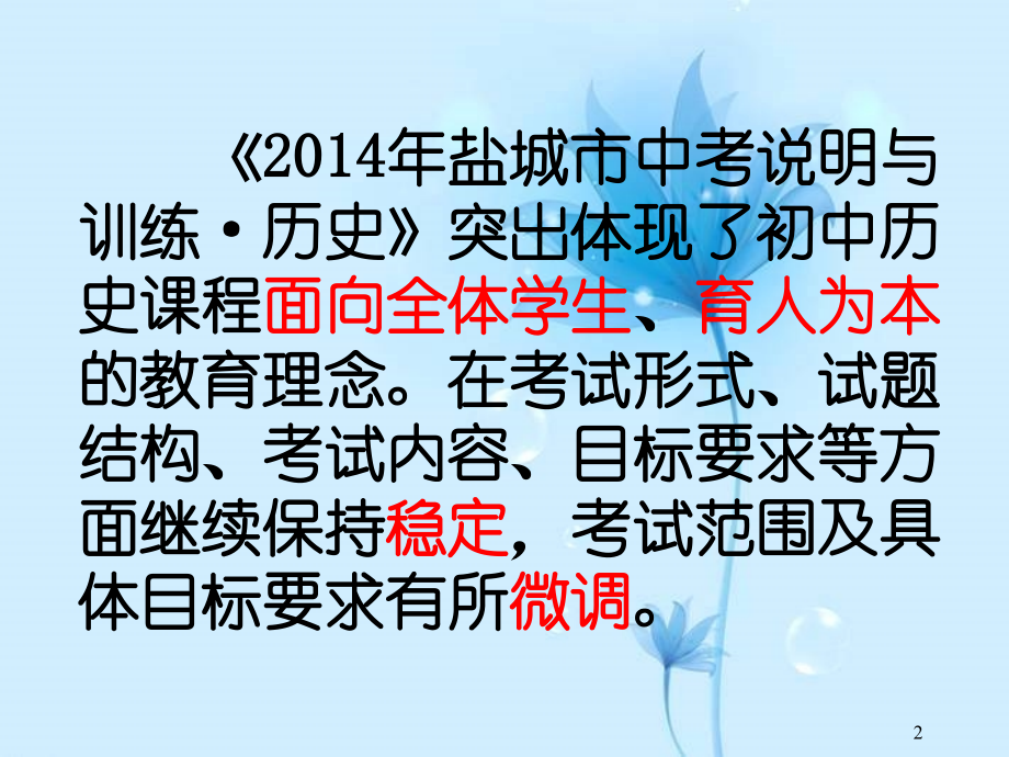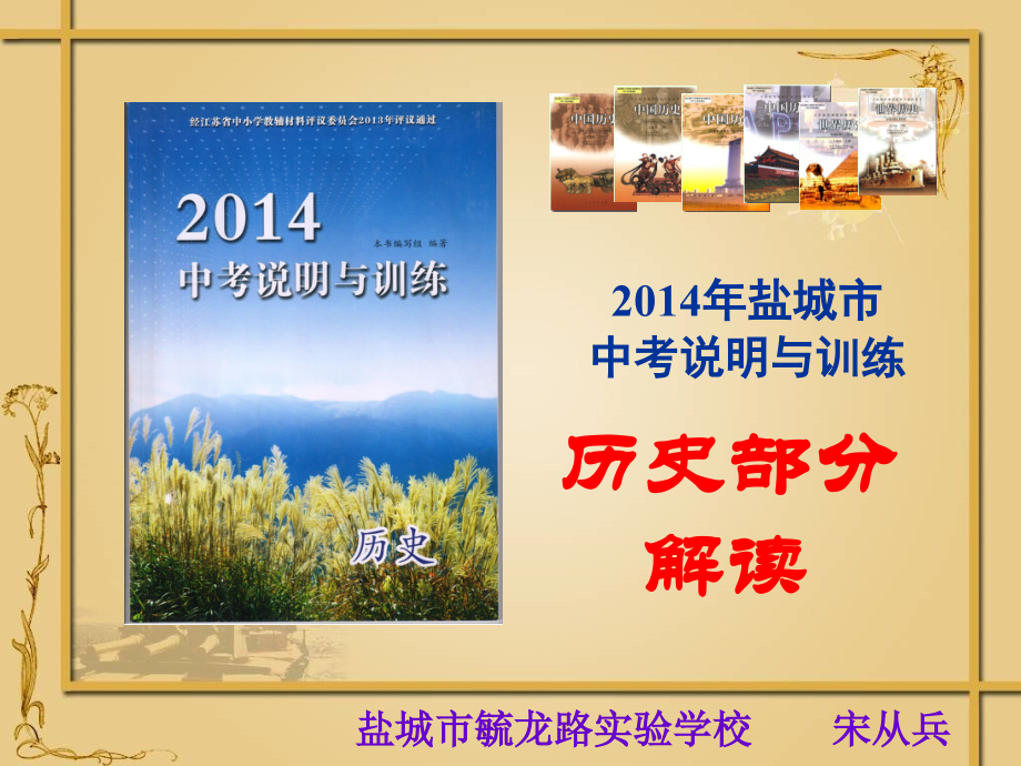 单击此处编辑母版标题样式,单击此处编辑母版文本样式,第二级,第三级,第四级,第五级,#,单击此处编辑母版标题样式,单击此处编辑母版文本样式,第二级,第三级,第四级,第五级,#,单击此处编辑母版标题样式,单击此处编辑母版文本样式,第二级,第三级,第四级,第五级,#,历史部分,解读,2014,年盐城市,中考说明与训练,盐城市毓龙路实验学校 宋从兵,2014,年盐城市中考说明与训练,历史,突出体现了初中历史课程,面向全体学生,、,育人为本,的教育理念。在考试形式、试题结构、考试内容、目标要求等方面继续保持,稳定,,考试范围及具体目标要求有所,微调,。,2,五项内容:,1.,指导思想;,2.,考试形式与试题结构;,3.,考试内容、范围与目标要求;,4.,题型示例;,5.,综合练习;,不,变,3,历史样卷,删除,4,一、指导思想,2014,年盐城市高中阶段学校招生考试历史学科的命题将以,义务教育历史课程标准(,2011,版),为指导导,以考试说明为依据,实现对初中历史学科的,主干知识,、,学科能力,和,情感态度,相统一的考核目标。,5,二、考试形式和试题结构,1,考试形式:,2,考试时间:,3,试题分值:,4,试题结构:,5,试题难易度:,6,考查的知识比例:,没有变化,6,1.,考试内容,全日制义务教育,历史课程标准,(,2011,年版),和据此编写的人教版七至九年级历史教材中的必修内容。,三、考试内容与要求,7,(,1,)掌握和运用知识,熟悉历史事实,掌握历史概念,辨别历史事物,分析历史结论,把握历史规律,阐释历史本质,2.,目标与要求,三、考试内容与要求,能力,与要求,8,审读图文资料,理解问题内涵,整合材料内容,获取有效信息,使用有效信息,支持观点成立,(,2,)获取和解读信息,2.,能力,与要求,三、考试内容与要求,观察历史情境,深化知识理解,9,观察,历史情境,,深化知识理解,良好的情境教学不仅有助于学生的认识活动,而且更有利于激发学生的情绪情感,从而产生一种巨大的教育力量。学生在兴奋、热情的状态下掌握的东西,能理解得更好,知识记得更牢固,更长久,也就是学习活动能得到最大的成效。,10,1,语言情境,缺少感染性,。,2,问题情境,缺少思维性,。,3,联系现实,缺少生活性,。,4,利用多媒体创设情境方面,缺少,目的性、针对性、实效性,等,。,目前历史教学情境创设方面存在一些问题,11,经典案例,1,:,在美国,有这样一堂历史课。老师一上课就宣布了刚刚进行过的考试的结果。当他发现一些考得不好的学生垂头丧气时,便说:“如果要想加分数,就给我,10,美元。但是,只能是白种人的学生。”学生们一听便都愤怒喊叫,拼命跺脚,把课本、书包扔向教师,表示抗议。老师则像变魔术一样,拿出早已准备好的盾牌来抵挡,并用水枪向学生扫射。学生们的情绪达到了愤怒的顶点。这时,老师才对他们严肃地说:刚才就是当年美国黑人领袖马丁,路德,金反对种族歧视,组织示威游行而遭到白人警察阻挠的情景。他倒在了统治者的真枪实弹之下,献出了自己宝贵的生命,但他给我们却留下了,我有一个梦,。今天我们就来走近这位令人肃然起敬的历史伟人,学习他这篇著名的演讲,何谓历史教学情境?,12,经典案例,2,:,谁都知道美国独立战争。学生的教科书在说明战前宗主国英国和北美殖民地人民日益紧张的关系时,喻之为“家长和长大了的孩子之间的关系”并提示孩子们:通过回想他们的父母公布新规定和强行让他们做什么事时的感觉,来领会这一关系。老师又是怎么讲的呢,?,一天上课,老师宣布:“由于教学经费紧张,本来是免费提供的课堂用纸,今后,5,分钱一张。现在,大家拿钱来领纸,准备小测验。教室里一片喧哗,孩子议论纷纷:“这不公平,为什么事先不通知我们?为什么要,5,分一张?商店里真的不是这价钱啊!”我的钱,买了纸,就不够午饭了,怎么办,?”“,怎么别的老师不收我们的钱,?”,看着学生的各种表情:沮丧、吃惊、生气、不知所措,有的甚至小脸都憋红了,老师一再说:“对不起,可是我不得不这样办。”,何谓历史教学情境?,13,孩子们持续不安,老师坚持要收钱再发纸测验。一些平时的乖孩子,无可奈何地拿出零用钱,取了纸。接着又有一些孩子垂头丧气地说:“我会还钱。”也领了纸。一个叫艾米的女孩儿刚开始很坚决地表示:“我就不交钱。”到了这份上,也只好许诺以后还钱,领了纸。老师发了试题,学生们闷头做答。只见最后一题写道:“关于花钱买纸的事,不是真的。写出你当时的感受。”,老师事后讲:“我是个不会说谎的人,得低头不看他们才能继续装下去。好几次我都快憋不住了,但还是忍住了。我是想让孩子们得到那种感受:当英国议会决定向殖民地强行征收印花税时人们的心情。”,14,什么是教学情境?应当说,上面两个案例就是典型。它告诉我们,所谓,“,情境,”,是指,“,对人引起情感变化的具体自然环境或具体社会环境,”,。所谓,教学情境,,是指知识在其中得以存在和应用的环境背景或活动,其特点和功能是能够激发和推动学习者的认知活动、实践活动以及情感活动等,能够提供学习的素材。,15,而教学情境作为课堂教学中,富有感情色彩,的场景和氛围,在完整意义上又分为,人文情境,与,科学情境,。其中,前者是,感性的、具体的、情感化的,强调想像与迁移,审美与思辩,;后者则是,理性的、抽象的、简化的和实在的,强调的是理智与逻辑,。只有这两种情境和谐自然地并存于课堂教学中,才可以使课堂教学生态趋于平