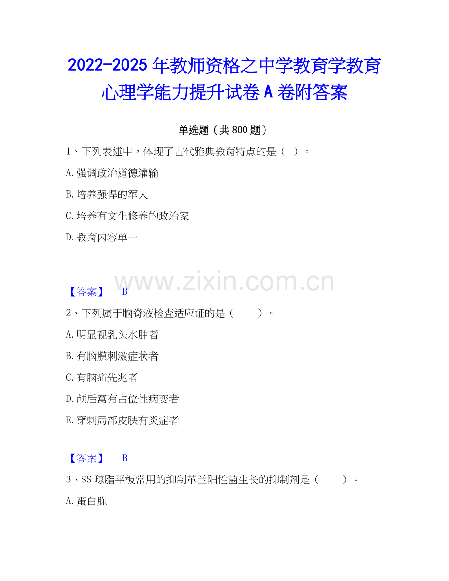 2022-2025年教师资格之中学教育学教育心理学能力提升试卷A卷附答案