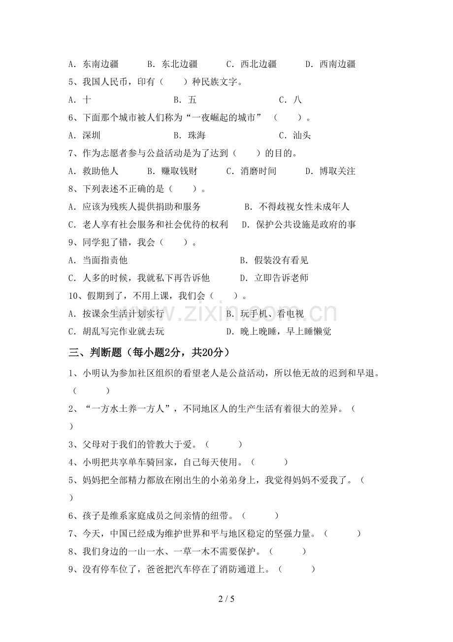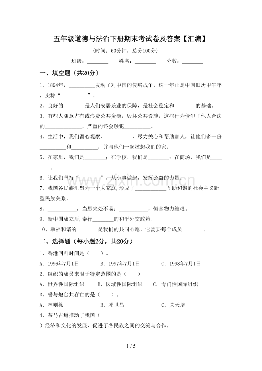 五年级道德与法治下册期末考试卷及答案【汇编】