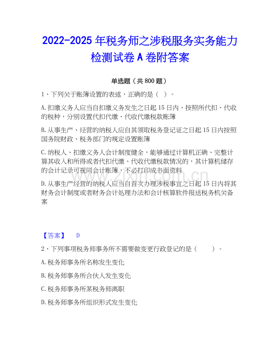 2022-2025年税务师之涉税服务实务能力检测试卷A卷附答案
