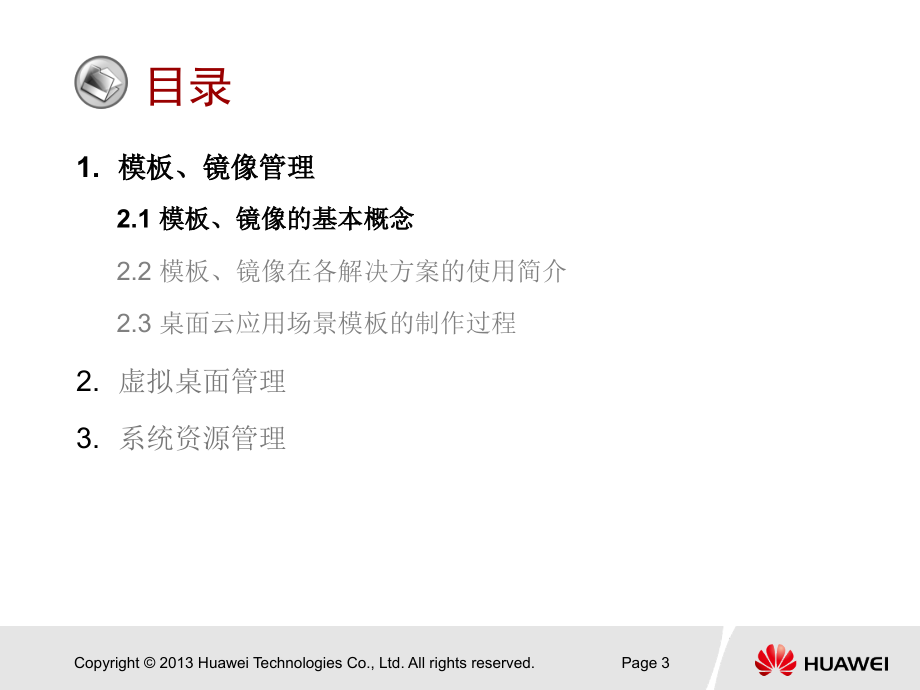 单击此处编辑母版标题样式,单击此处编辑母版文本样式,第二级,第三级,第四级,第五级,Copyright 2013 Huawei Technologies Co.,Ltd.All rights reserved.,Page,#,Thank you,单击此处编辑母版标题样式,单击此处编辑母版文本样式,第二级,第三级,第四级,第五级,Copyright 2013 Huawei Technologies Co.,Ltd.All rights reserved.,Page,#,修订记录,课程编码,适用产品,产品版本,课程版本,ISSUE,HC1108110,云计算,V100R003,V1.0,开发,/,优化者,时间,审核人,开发类型(新开发/优化),袁京,-1,2,2013-06,Fly,新开发,廖三平,-3,伍增田,-4,本页不打印,第十章,业务管理,目标,学完本课程后,您将能够,:,模板、镜像管理,虚拟桌面管理,系统资源管理,目录,模板、镜像管理,2.1,模板、镜像的基本概念,2.2,模板、镜像在各解决方案的使用简介,2.3,桌面云应用场景模板的制作过程,虚拟桌面管理,系统资源管理,回顾,-,虚拟机是怎样攒出来的,1,、从存储的池子里捞了个,100G,硬盘,是个虚拟的,还是空的,2,、从一堆物理服务器中找了一台,这台服务器上正好有两个空闲的,CPU(,虚拟的,),,,2G,空闲的内存,,1,块虚拟网卡,3,、用这些,CPU,,内存,硬盘启动了一个无系统虚拟机,4,、找来一个,Win7,offcice,foxmail,的,ISO,文件,5,、使用,CIFS,协议将,ISO,挂载到,VNA,节点,设置虚拟机从虚拟光驱启动,加载,ISO,文件,6,、,VNC,登录界面按照提示安装系统,我要一个虚拟机,双,CPU,,,2G,内存,,100G,硬盘,,1,块网卡,操作系统是,Windows7,,装了,office,,,foxmail,业务要求,虚拟磁盘,DIY,硬件,装,OS,以上标准的虚拟机创建过程,还有无优化的地方?,每次需要人工安装,OS,,是否能够自动化?,安装,OS,过程耗时费力,如何能够缩短创建时间,特别是批量创建情况下?,模板、镜像的引入,解决了以上问题,极大优化了虚拟机的创建,模板的基本概念和使用,基本概念:,模板本质上,就,是虚拟机,模板仅为虚拟机的属性,可先创建虚拟机(裸虚拟机、,OS,文件),再将虚拟机属性修改为模板,模板作用是创建虚拟机,具有以下特点,创建虚拟机卷过程,就是用模板的卷复制一份新卷过程,无需人工参与安装,OS,,可快速批量复制,无需特殊存储介质存储模板,本地磁盘、,SAN,等皆可,数据存储,1,数据存储,2,数据存储,3,模板,新虚拟机,卷,1,卷,2,卷,1,卷,2,卷,1,卷,2,虚拟机模板类型,完整复制:每个虚拟机都分配独立的系统磁盘,链接克隆:一组虚拟机共享一个系统盘,系统数据保存在系统盘,用户数据保存在差分盘,Personal vDisk,:一组虚拟机不仅共享一个系统盘,同时专有个人虚拟磁盘,用于存放系统数据,用户数据存储在差分盘,镜像的基本概念和使用,基本概念:,镜像形态上也是,模板,(,vhd,格式磁盘文件、元数据文件),不同之处为导出在专门镜像服务器上存放和管理,镜像应用于公有云场景,兼容,EC2,的使用镜像部署虚拟机功能,具有以下特点,公有云往往规模较大,部署多套,VRM,系统,通过镜像可跨,VRM,部署虚拟机,镜像集中存储,便于统一维护和管理,镜像服务器,目录,业务管理概述,模板、镜像管理,2.1,模板、镜像的基本概念,2.2,模板、镜像在各解决方案的使用,2.3,桌面云应用场景模板的制作过程,虚拟桌面管理,系统资源管理,各解决方案镜像、模板制作方式,解决方案,镜像、模板使用方式,FusionCube,在,FusionManager,上制作模板,FusionSphere,1,、服务器虚拟化场景,,FusionCompute,、,FusionManager,皆可提供模板制作功能,2,、公有云场景,如果部署,FusionStack,(云基础设施层),可通过,FusionCompute,“导出模板”功能制作镜像,镜像指定存储在,FusionStack,的镜像服务器内。,FusionStack,自动感知新镜像文件的加入,人工进行镜像的注册、注销等管理操作,FusionAccess,在,FusionManager,制作虚拟机模板,然后使用,FusionAccess,的镜像工具完成虚拟机系统的定制和封装,FusionCube,模板使用简介,使用,FusionManager,的,Portal,虚拟机模板,:,管理员可以制作不同的虚拟机模板,自定义操作系统、规格、虚拟机上的软件,服务模板,:,管理员通过服务模板来发布应用,可以使用服务模板设计工具,通过简单的拖拽方式快速地设计出满足企业需求的应用模板,。服务模板的核心是虚拟机模板,部署应用时使用虚拟机模板创建虚拟机,FusionSphere,模板使用简介,使用,FusionCompute,的,Portal,虚拟机模板,:,管理员可以制作不同的虚拟机模板,。支持使用虚拟机模板部署虚拟机,,部署过程中即可按照虚拟机模板的默认规格,也可,自定义,规格,FusionAccess,模板使用简介,使用,FusionAccess,的,Portal,虚拟机模板,:,管理员可以,选择虚拟机模板部署虚拟机,,部署过程中即可按照虚拟机模板的默认规格,也可,自定义,规格,目录,业务管理概述,模板、镜像管理,2.1,模板、镜像的基本概念,2.2,模板、镜像在各解决方案的使用简介,2.3,桌面云应用场景模板的制作过程,虚拟桌面管理,系统资源管理,完整复制模板制作流程,关键步骤,-,创建虚拟机模板,创建虚拟机模板本质就是创建虚拟机,包括以下步骤,在,FusionManager,选择创建虚拟机模板,选定虚拟机模板类型,选定虚拟机规格,挂载,ISO,操作系统文件,创建虚拟机,使用,VNC,登录,安装操作系统,激活,administrator,账户,关闭防火墙等,关键步骤,-,配置和优化桌面运行环境,使用,VNC,将工具软件,iso,挂载到虚拟机内作为虚拟光驱,并执行以下操作:,选定模板类型,:(,1,),快速封装、(,2,)完整复制、(,3,)链接克隆,使用“桌面云制作镜像优化工具”配置操作系统,包括指定代理软件如,PV Driver,安装路径、设置,windows,产品序列号
