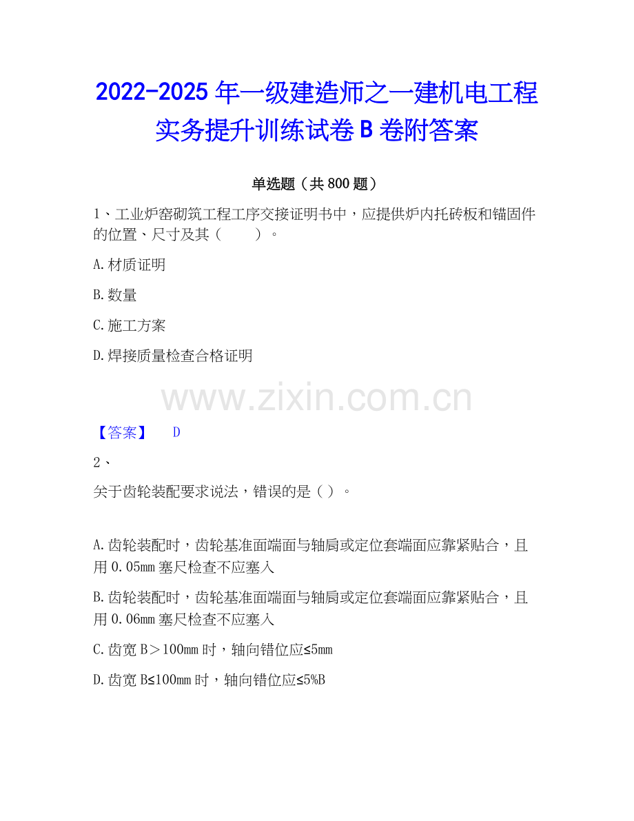 2022-2025年一级建造师之一建机电工程实务提升训练试卷B卷附答案