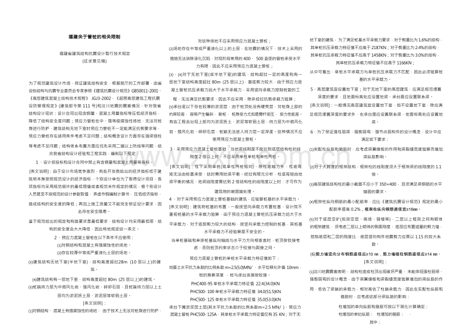 为了规范建筑设计市场,保证建筑结构安全,根据我厅的工作部署,由省 设协结构与抗震专业委员会专家参照《建筑抗震设计规范》GB50011-2001、 《高层建筑混凝土结构技术规程》 JGJ3-2002、《超限高层建筑工程抗震 设防管理规定》(建筑部令第 111 号)和汶川地震的震害情况,针对我省 结构设计现状:设计合同出现含钢量、混凝土用量指标等压低经济指标, 降低了结构安全度问题;预应力管桩在中、强等级腐蚀性场地,无法对桩 身进行防护,建筑结构无地下室时预应力管桩不一定能满足抗剪要求等, 预应力管桩存在适用条件考虑不足问题;结构概念设计方面存在强梁弱柱