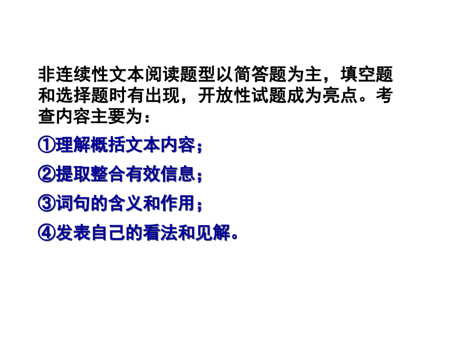 宇轩图书,非连续性文本阅读,非连续性文本阅读题型以简答题为主,填空题和选择题时有出现,开放性试题成为亮点。考查内容主要为:,理解概括文本内容;,提取整合有效信息;,词句的含义和作用;,发表自己的看法和见解。,四、常考考点、题型和方法指导,1,整体感知,把握文本的主要内容,题型:综合上述文本,简要概括主要内容。,答题方法:,首先查看标题,了解文本的阐述方向;其次快速浏览全文,概括每则材料和图表在内容和观点上的共同点,从而归纳出文本的主要内容。,2,理解文意,提取、整合信息,题型:,(1)“”,一词是什么意思?,(,或:请简要谈谈对“,”,词语的理解,),(2),人们对该事件,(,现象,),有哪些观点?请简要概括。,(3),请概括某则材料的主要信息。,(4),阅读文本,选出下列理解和分析正确,(,错误,),的一项。,(5),概括或推断这种问题或现象出现的原因。,(6),有关部门在“,”,方面采取了哪些措施?,答题方法:,仔细审读题干,确定答题范围,在文本中找到相关信息的确切位置。,在信息区间筛选关键词句,提取有效信息,分条归纳作答。,对于选择题,要在文本中找到每个选项的出处,仔细比较选项和原文的差别,注意有无偷换概念、以偏概全、混淆时态、答非所问、无中生有、强加因果等问题。,(,具体可参考说明文专题相关内容,),3,品味文本的语言,题型:,(1),文中的加点词有什么含义?,(2),画线句的作用或表达效果是什么?,答题方法:,非连续性文本里面包含了若干个连续性文本的阅读,这些材料多采用记叙、议论、说明等表达方式,所以赏析文本语言时可以从表示修饰限制等作用的词语、句式特点、修辞手法、表现手法、说明方法、论证方法等角度入手。,4,结合文本内容,解决具体问题,题型:,(1),就“,”,问题或现象、事件,谈谈你的看法。,(2),结合生活体验,谈谈材料给你的启示。,(3),请根据材料,提出几点建议。,答题方法:,表达自己的看法、认识或感受,要结合文章相关内容精练清晰地表达自己的看法,组织答案时可以采用总分结构,即“我认为,,理由是,”,。,启示类答题时要注意联系文本的主题思想,看文中坚持什么、反对什么、提倡什么,不能反其道而行之。针对文中出现的问题、现象,着重回答应该怎么做。,建议类答题时要紧扣阅读材料,提出的建议要合理,具有操作性,然后分条组织答案。,(1),什么是电脑视疲劳综合征?阅读材料后简要回答。,(3,分,),_,解析:,本题考查概括文章内容的能力。可从电脑视疲劳的成因、症状方面作答。关键词句都在文中,只是需要,截取、重组,。,答案:,电脑视疲劳综合征是指长时间使用电脑,眼睛过度疲劳所引发的,(,视力及身心方面的,),一系列症状,(,包括眼干、头晕、疲倦、恶心等,),。,(2),阅读上述材料,下列理解和分析不正确的一项是,(,)(3,分,),A,电脑用户和痴迷电视、手机的人容易得视疲劳综合征。,B,持续的重度视疲劳对身心的伤害非常大,需要引起我们警惕。,C,导致中国一年,60,万人“过劳死”的原因就是过度的视觉疲劳。,D,长期疲劳用眼会使近视加重,高度近视者更容易出现视网膜裂孔。,【,专家观点,】,胡向明,(,视疲劳缓解研究专家,),:中国一年有,60,万人“过劳死”,很多都市白领处于“亚健康”的状态。这一群体的共同点是年龄多在,20,岁到,40,岁之间,主要从事脑力劳动,长期面对电脑。,过度的视疲劳会直接导致心、脑受损,这是“过劳死”的诱因之一。,(,瞭望,2013,年第,14,期,),C.,导致中国一年,60,万人“过劳死”的原因,就是,过度的视觉疲劳。,(3),请你根据,【,调查统计,】,及上述其他材料,写出“青光眼出现年轻化趋势”的两个原因。,(4,分,),_,解析:,本题考查分析探究能力。读图要关注表头,从年轻网民所占比例方面回答问题;分析材料要善于抓住材料所反映问题的共同点,抓住本文说明内容的关键点“视疲劳”思考作答。,答案:,在中国网民中年轻人所占比例很高,人数很多。许多年轻人长期面对电脑,容易引发过度视疲劳。,(4),暑假里,一些同学可能会迷上电脑、手机,应当如何,预防,电脑视疲劳呢?请根据上述材料,提出四点建议。,(4,分,),_,解析:,本题考查拓展应用能力。要抓住“预防”二字,从文中的“专家观点”部分提取所需答案。,答案:,不要长时间面对电脑、手机。,不要躺着玩电脑、手机。,夜间不要关着灯玩电脑等。,玩电脑一段时间后要远眺一会儿。,有高度近视的同学最好查一下眼底,及时发现问题。,电脑屏幕要干净。,屏幕亮度和颜色对比度应调至最舒适的状态。,(,答出四点即可,),2,阅读下面的文章,完成,(1),(4),题。,(12,分,),走进数字化阅读,【,权威调查,】,2013,年,4,月,中国新闻出版研究院公布了,2012,年全国国民阅读调查结果。其中,18,70,周岁国民数字化阅读方式,(,手机阅读、网络在线阅读、电子阅读器阅读、光盘阅读、,MP4,/MP5/,PDA,阅读等,),的接触率等数据引发人们的关注。,表一:,2011,、,2012,年,18,70,周岁国民数字化阅读方式的接触率,年度,手机阅读,网络在线,阅读,电子阅读,器阅读,光盘阅读,MP4,等阅读,2011,27.6%,29.9%,5.4%,2.4%,3.9%,2012,31.2%,32.6%,4.6%,1.6%,2.6%,表二:,2012,年,18,70,周岁国民手机阅读人群的手机阅读内容统计,内容,手机,QQ,等,手机小说,手机报,与工作、学习,有关的信息,电子邮件,比例,64.1%,47.3%,41.1%,17.1%,10.2%,(2),阅读上述材料,下列说法不正确的一项是,(,)(2,分,),A,对于数字化阅读,可以说是众说纷纭,各有