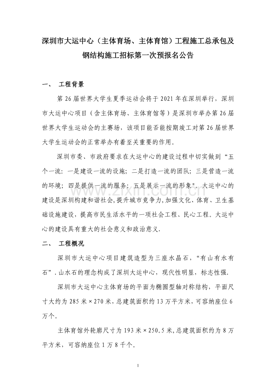 深圳市大运中心(主体育场、主体育馆)工程施工总承包及钢结构施工招标第一次预报名公告