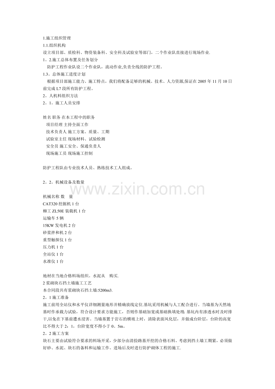 根据项目部施工能力、施工特点,我们将配备足够的机械、技术、人力资源,保证在2005年11月10日前完成L7段所有防护工程。