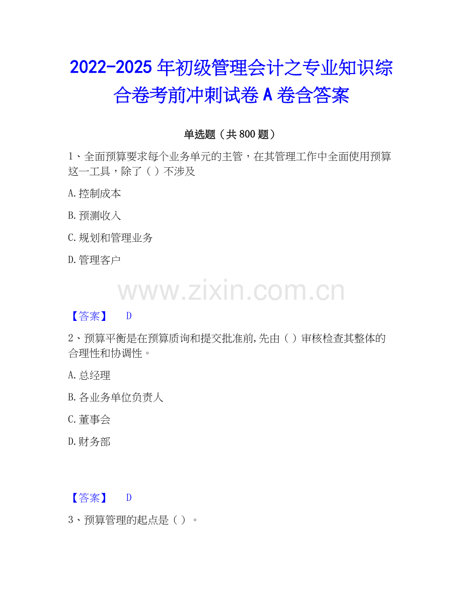 2022-2025年初级管理会计之专业知识综合卷考前冲刺试卷A卷含答案