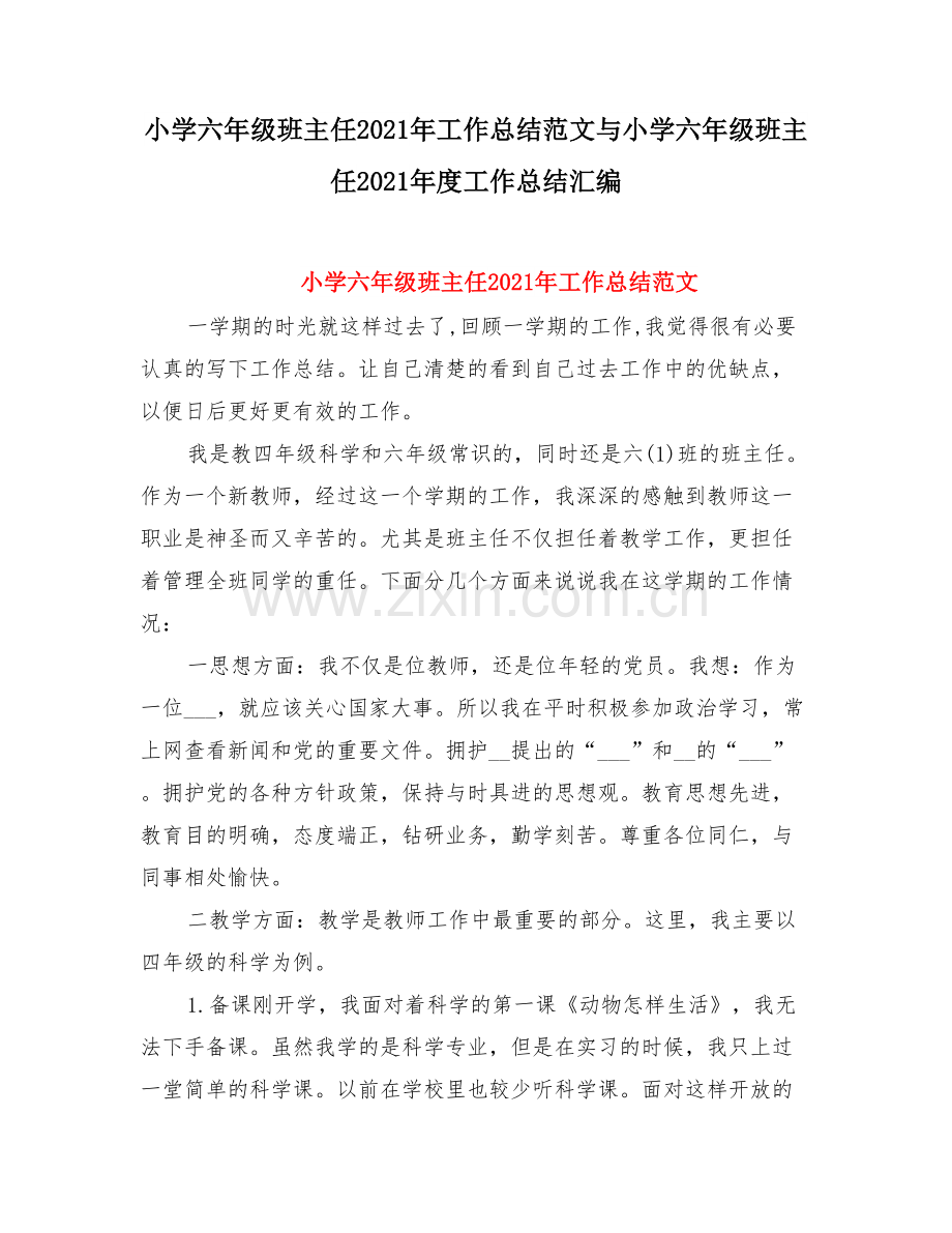 小学六年级班主任2021年工作总结范文与小学六年级班主任2021年度工作总结汇编