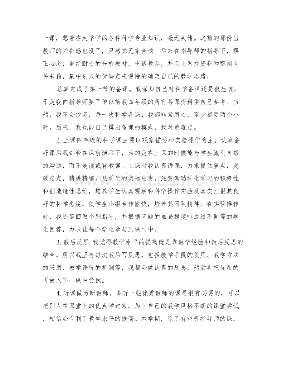 当然,在教学上还有做的很不够的地方:如对学生的课后辅导和对学生作业的监督。因为我总共教六个班级,对学生的名字都很难记住,学生对科学并不是很重视,有时就不做作业,面对大多数学生的这种行为,我感觉自己根本没精力抓。后来,我想就是我这样次次的松懈才使学生对科学更不在乎了。下学期,我要在这两个方面抓紧,可以利用课余的时间对学生进行辅导或探讨科学问题,增加与学生的沟通,使他们更喜欢科学课。同时要主动与家长联系,使家长了解科学的重要性,以便在家里对孩子进行必要的辅导和监督。