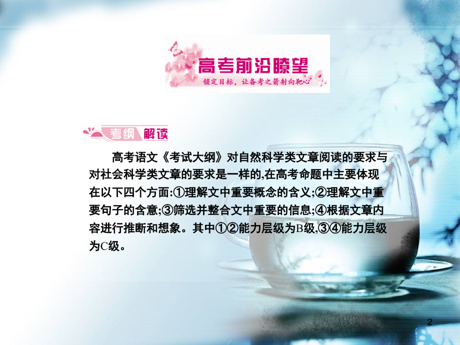 单击此处编辑母版标题样式,单击此处编辑母版文本样式,第二级,第三级,第四级,第五级,*,1,高考语文考试大纲对自然科学类文章阅读的要求与对社会科学类文章的要求是一样的,在高考命题中主要体现在以下四个方面:理解文中重要概念的含义;理解文中重要句子的含意;筛选并整合文中重要的信息;根据文章内容进行推断和想象。其中能力层级为,B,级,能力层级为,C,级。,2,近几年,各地对自然科学类文本的考查,在题型设计上呈现出一些变化。综合近两年的考试情况,科技类文本的考查有如下几个特点:,1.,考点轮流考查,试题数量减少,对考试大纲规定的,7,个考点,全国卷和各省市卷都不作全面考查,而是抽出,24,个考点,轮流考查。试题数量也相应减为,24,题。统计显示,下列考点考试频率较高:理解文中重要词语的含义;理解文中重要句子的含意;筛选并整合文中的信息;根据文章内容进行推断。,2009,年只有湖南等,4,个省市考了自然科学类文章阅读试题。,3,2.,题型以单选题为主,兼有判断题和主观题,科学类文本阅读的考查以单项选择题为主,每题,3,分。北京卷、上海卷有判断题、填空题、简答题等题型。,3.,侧重考查理解、分析综合能力,不涉及鉴赏评价和探究能力,理解文中重要的词语、理解文中重要的句子,主要关涉理解能力。筛选并整合文中的信息、根据文章内容进行推断,主要关涉分析综合能力。一般来说,科学类文本阅读较少涉及鉴赏评价和探究能力的考查。,4.,命题材料新颖,多关涉科技动态和当代生活,科学类文本阅读考查选用的材料,通常是反映自然科学领域最新动向的文章,其涉及的内容相对考生而言,是比较“新”或是比较“陌生”的“新知识”,这些“新知识”反映了自然科学的研究动态和成果,并且与国计民生、科技发展密切相关。,4,根据对近几年全国各地高考试卷在本考点的命题分析,结合,2010,年高考语文考试大纲要求,特对,2011,年高考作如下展望:,1.,科技类文本阅读命题每年虽有变化,但稳定仍是主要的,表现在:考点相对集中,多见于理解词句、筛选整合信息、推断;设题技巧比较固定,如干扰项大多为偷换概念、无中生有、以偏赅全、张冠李戴、或然与必然混淆、未然与已然混淆、因果颠倒、强加因果、答非所问等;在准确理解信息基础上进行判断和推理是科技类文本阅读考查的重点。,2.,选材的多样化现象有所改变。,2007,年的考查主要涉及“生物、理化”两大类,这和以往所选的医学、气候、海潮、太空等多样题材相比,内容覆盖面相对较小。,3.,文字障碍相对较小,阅读难度有所降低。,2008,年的,46,段文字基本没出现专业性太强的词句,也没有生僻字词,一般考生都能较为顺利地读懂文章,这点在今后可能体现得更明显。,5,授课提示:对应学生用书第,297,页,自然科学类文本阅读考查的考点,主要见于“考纲阐释”所述的,7,个方面。下面就与科学类文本阅读密切相关的,4,个考点一一解说。,一、理解文中重要词语即概念的含义,科学类文本中的重要词语,主要是一些重要的概念。阅读时只有把握这些概念的内涵,并明确概念所包含的对象,才能真正读懂这类文章。一般来说,科技类文本中的重要概念,内涵相对固定,所包含的对象十分明确,只有这样,文章的思维才能在概念这一基础“锚桩”的固定下展开。,6,明确概念主要包含明确内涵和外延两个方面。概念的内涵是事物的本质特征,是一个事物区别另一个事物的标志;概念的外延是指具有这一特征的所有对象,是概念包含的所有事物。,明确概念内涵的方法是下定义。下定义的公式可表述为:被定义的概念=特征+邻近的属概念。邻近的属概念就是被定义概念最接近的上位概念。如“平行四边形”邻近的属概念是四边形,“沙尘暴”邻近的属概念是风沙天气现象,等等。如对“沙尘暴”的解释:沙尘暴是由于风将大量沙尘卷起,使空气混浊,能见度小于千米的风沙天气现象。这一语言表述形式完全符合下定义的公式,其中“风将大量沙尘卷起,使空气混浊,能见度小于千米”就是“沙尘暴”这一概念的特征即内涵,“风沙天气现象”就是邻近的属概念。,明确概念外延的方法是分类别。分类别就是按照一定的标准把概念包含的事物分成若干个小类。在分类别时,一定要注意标准一致和列举充分。,7,二、理解文中重要句子即判断的含意,自然科学类文本中的重要句子,主要是一些关涉全文主要内容的重要判断。这些判断或对说明的对象的性质有所断定,或提出一个重要的观点,或在陈述科技事实后得出结论。无论哪种情况,这些句子都包含两个必要的因素:被解说的对象、被断定的属性。,8,三、筛选并整合文中的信息,筛选并整合信息,是自然科学类文本阅读最核心的能力,因此成为历年各地高考必考的考点。所谓筛选,就是对文章呈现的信息作出区分,挑选出重要信息、次要信息和冗余信息。一般来说,文章中的句子不都具有同等的地位和作用,有的句子居于主要地位,承载着文章重要信息,有的句子或阐释,或说明,或叙述,或补充,居于次要地位,承载着次要信息;有的句子可有可无,有它有利于内容的准确、全面表达,删除后也不影响文章内容的表达,其承载的是冗余信息。筛选就是这样一个区分信息主次的过程。这种区分与阅读理解高度相关,所以叫理解性筛选。还有一种检索式筛选,即按照一定的要求,迅速